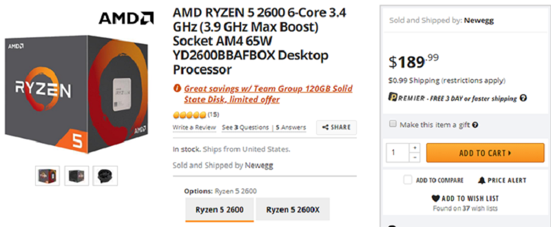 Модели Ryzen второго поколения «похудели» на величину от 10 до 20 долларов. В угоду американским поклонникам AMD интернет-магазин newegg.com снабдил коробочные версии процессоров Ryzen 7 2700 и Ryzen 5 2600 бесплатным приложением в виде «загрузочного» твердотельного накопителя Team Group L5 Lite на 120 Гбайт. Стоимость последнего в качестве отдельного продукта составляет $34,99.