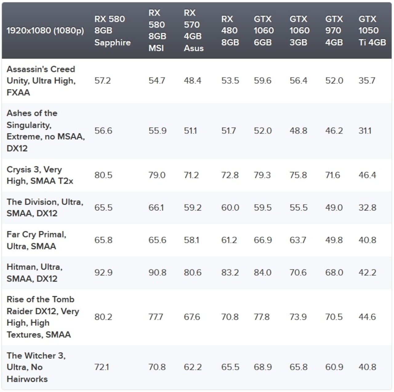 Как можно заметить, заявление AMD, что RX 580 хорошо подходит для QHD-разрешения, не вполне верно: средний FPS выше 60 выдается лишь в одной игре — Hitman (2016).