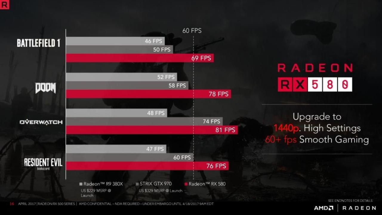 Перед запуском обновленного Polaris компания AMD выслала брошюры всем крупнейшим СМИ с инфографикой и данными о производительности. Согласно им, референсная Radeon RX 580 обгоняет R9 380X и GeForce GTX 970. Она способна выдавать стабильные 60 кадров в секунду в играх Battlefield 1, Doom (2016), Overwatch и Resident Evil 7 на максимальных настройках графики и в разрешении QHD/1440p (2560x1440).