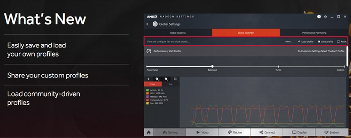 Обладатели конфигураций с двумя видеокартами, работающими в режиме CrossFire, оценят прирост производительности. Например, в Far Cry Primal пара Radeon RX 580 ровно вдвое быстрее одной видеокарты. Технология Radeon WattMan была доработана: настраиваемые профили теперь можно сохранять, перезагружать в более позднее время, а также передавать другим пользователям Radeon.