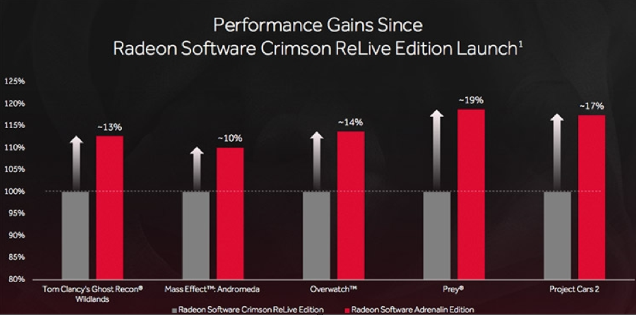 Новые драйверы приносят увеличение производительности во многих популярных играх, среди которых можно назвать Tom Clancy's Ghost Recon Wildlands, Mass Effect: Andromeda Overwatch, Prey и Project Cars 2. По сравнению с драйверами Radeon Software Crimson ReLive Edition владельцы адаптеров Radeon вправе рассчитывать на рост производительности на 10–19 %. Правда, здесь нужно оговориться, что сравнивается быстродействие Adrenalin с самой первой версией драйверов ReLive. Кроме того, разработчики уменьшили время отклика — в таких проектах, как Counter Strike, каждая миллисекунда имеет значение.