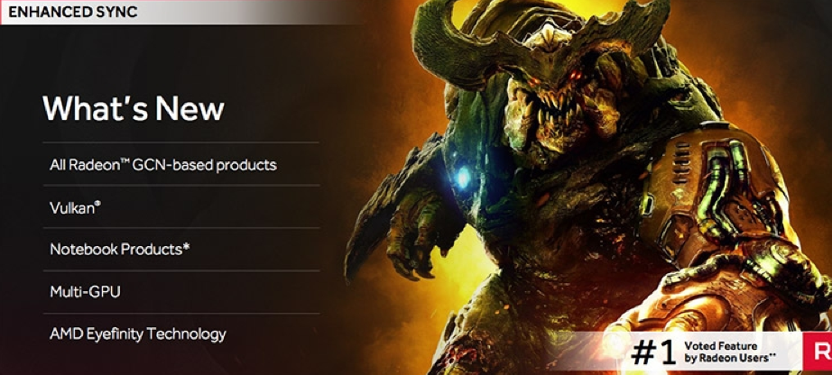 Улучшенная синхронизация (Enhanced Sync) теперь поддерживается во всех продуктах AMD на базе архитектуры GCN. Это касается в том числе игр на базе API Vulkan, ноутбучных видеокарт, конфигураций с несколькими ускорителями или дисплеями — технология Enhanced Sync будет работать во всех этих сценариях. А технологию Radeon FreeSync теперь можно отдельно включать или выключать для каждой игры.