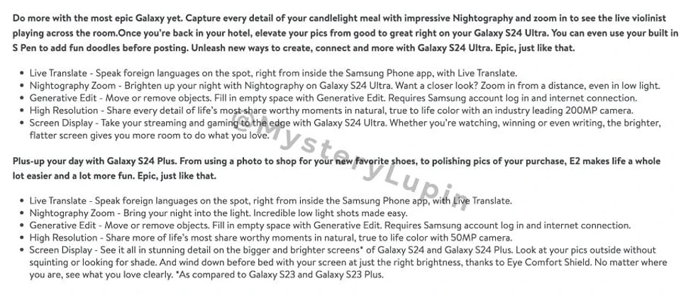 Пользователь Х (ранее Twitter) под ником MysteryLupin поделился маркетинговыми материалами, демонстрирующими ключевые функции искусственного интеллекта, которые дебютируют в серии Samsung Galaxy S24.