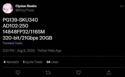 По его словам, GeForce RTX 4080 Ti (кодовое обозначение PG139-SKU340) будет базироваться на графическом чипе AD102-250. У этого GPU (урезанный вариант AD102-300, который установят в GeForce RTX 4090) с 14 848 ядрами CUDA и 116 SM-блоками. Объем видеопамяти формата GDDR6X составит 20 ГБ. Скорость — 21 Гбит/c. Шина памяти 320-битная. Пропускная способность — 840 ГБ/c.