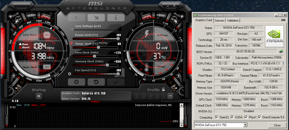 Функция поднятия напряжения в данной версии программы MSI Afterburner 4.1.0 не работала корректно, поэтому изменения данного значения в процессе оверклокинга не проводилось.