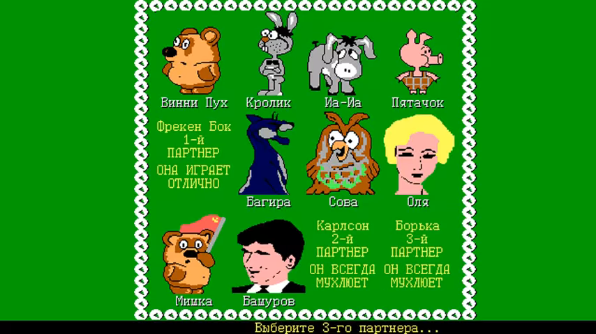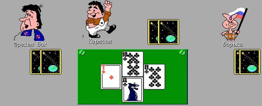 Еще один вариант карточной игры на четверых. Доступно 12 персонажей: 8 из советских мультиков, карикатурный Борька с российским флагом(перестройка, а что вы хотели? - прим.), коммунист Мишка, а также сам программист и некая Оля. Эта игра по темпу несколько быстрее, так как "народу" много, а количество карт ограничено. Чтобы игра была интереснее, она ставит различные условия для победы(не брать ничего, не брать "девочек", т.е. дам, не брать червей, брать все подряд и т. д - за "косяки" штрафовали). Выигрывает тот, кто наберет больше очков.
