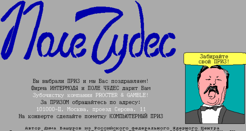 Помимо этого у автора были и другие игрушки, но они были популярны, в основном, у его коллег и широкого распространения не получили. Если что-то и удается найти, то авторство под вопросом, как вообщем-то и с "Дураком". А вот история с "Поле Чудес" действительно принесла в 90-е программисту нереальный хайп. Но каких-то баснословных денег Вадим Башуров за это не получил. Более того, программист чуть не стал замешанным в судебном разбирательстве с передачей. Оказалось, что с выходом игры люди серьезно думали, будто она связана с телевизионным шоу и слали тонны писем с требованием выслать приз, который был выигран в компьютерном "Поле Чудес".