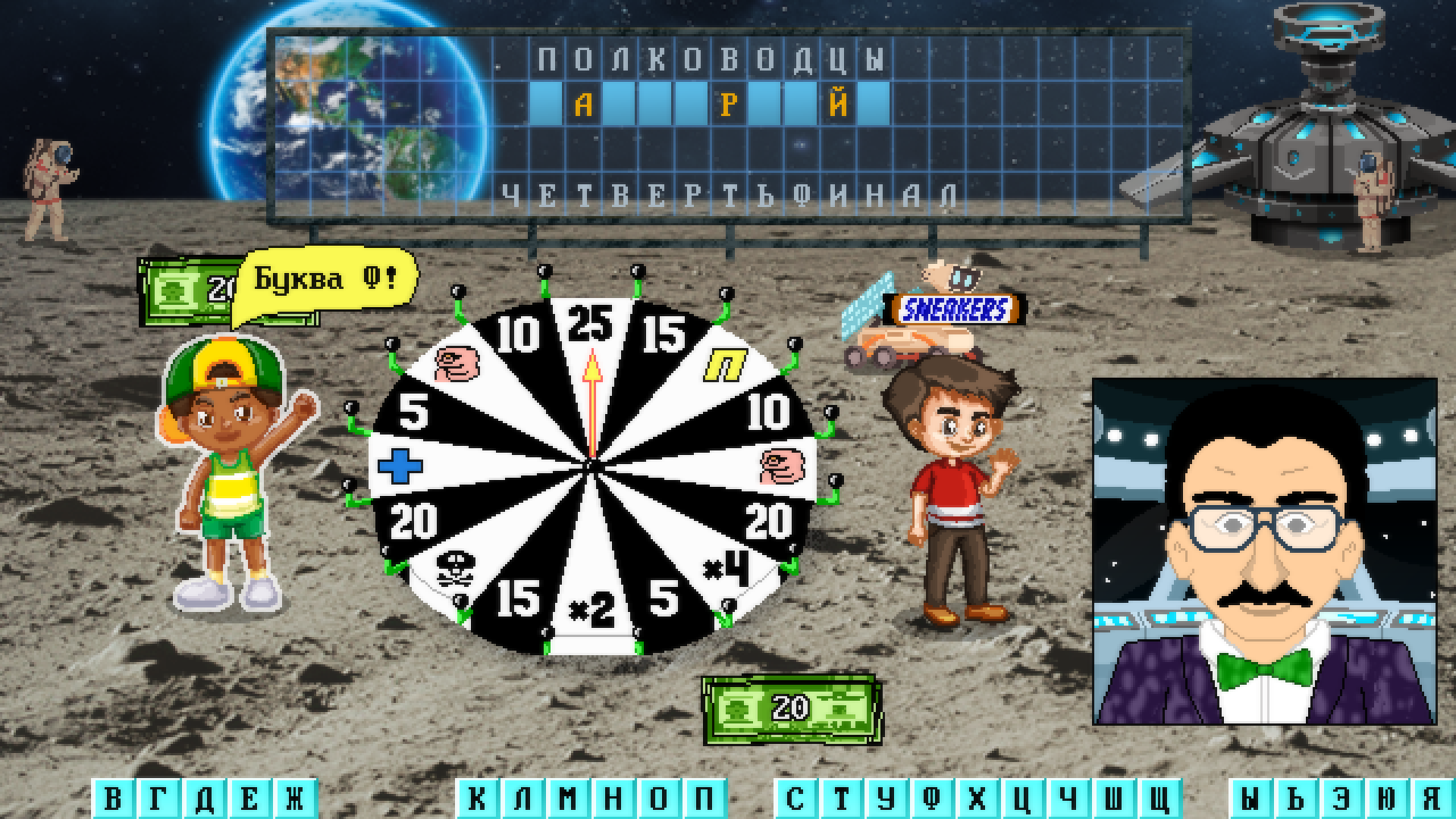Вот это точно знают все. Эта игра вроде как уже даже на смартфонах есть. Все как в передаче: три героя вращают барабан и угадывают слово на табло. Сразу надо заметить, что не все слова логически подходили к вопросам, ну да ладно. Само оформление было эпичным: стенка из Wolfenstein, срисованный пиксельный портрет Якубовича с какой-то желтой газетенки, ну и сам логотип. Кстати, батончики Snickers "впилены" в игру не просто так. Иметь коробку батончиков в то время было неслыханной роскошью. Спустя некоторое время, игру заметили в Израиле и попросили разрешения распространить по FIDO. С той поры понеслась известность.