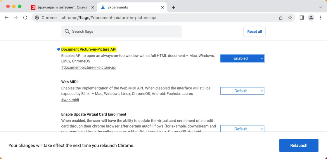Чтобы включить новую функциональность, установите тестовую версию Chrome и перейдите по адресу chrome://flags/#document-picture-in-picture-api и установите значение Enabled для параметра Document Picture-in-Picture API.