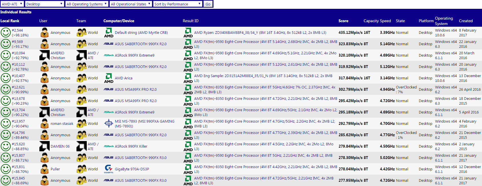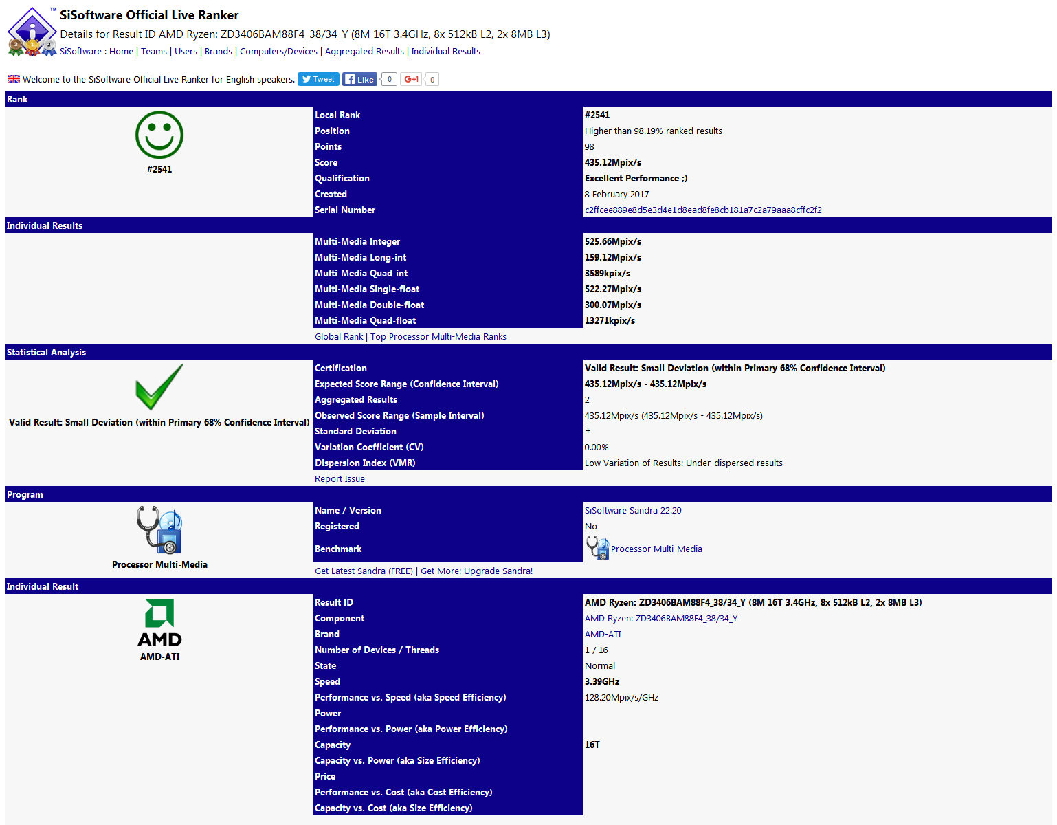 Процессор Ryzen с той же маркировкой — ZD3406BAM88F4_38/34_Y — был замечен в базе результатов бенчмарка SiSoftware Sandra 2015. Тест Processor Multi-Media был пройден с результатом 435,12 Мп/с, который превзошёл результаты выпущенных ранее CPU AMD, включая разогнанную до 5,14 ГГц модель FX-9590.