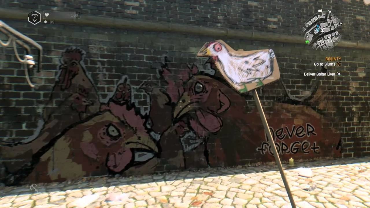 Сначала курицы появлялись на ранних концепт-артах. Потом были сделаны статичные модельки, которые кто-то тайком закинул в ранние билды дополнения. Они даже попросили звуковиков записать кудахтанье, поскольку один из них собирался поехать в деревню — ему нужно-то было только захватить с собой оборудование. Пётр Павлащук, ведущий дизайнер уровней в Techland