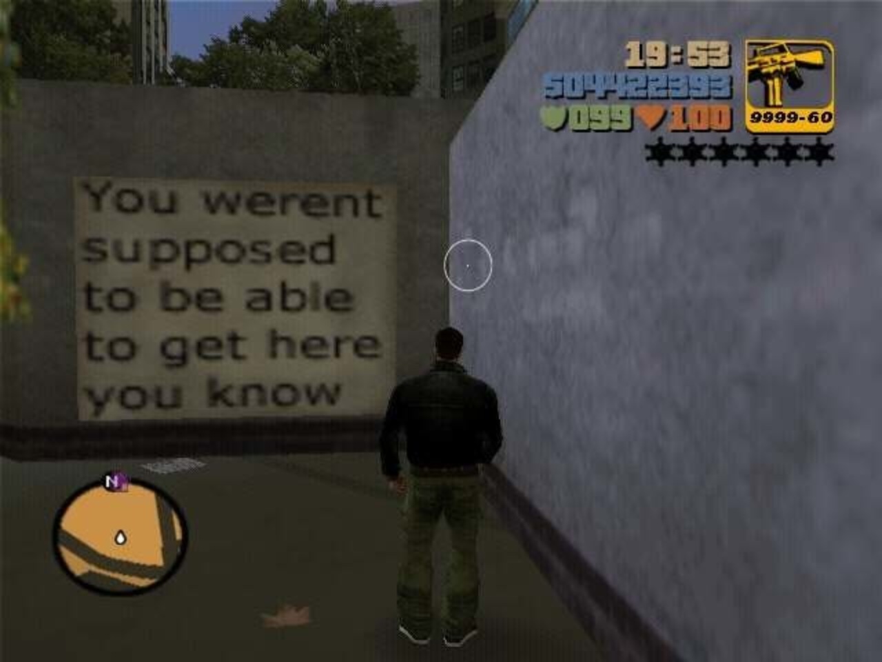 GTA 3. Надпись: «Знаешь, ты ведь вообще-то не должен был сюда попасть»