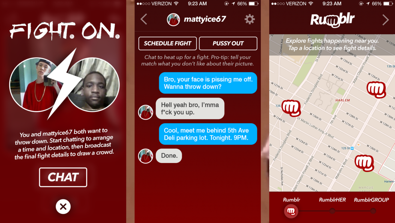 Rumblr — приложение, с помощью которого пользователи могут найти партнёра для боя поблизости. В своём профиле пользователи этого сервиса указывают рост, вес, уровень подготовки, любимые стили драки и другие параметры.