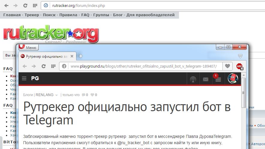 «Наш новорожденный бот в Телеграм : @ru_tracker_bot. Он знает все про раздачи Рутрекера, и ему скучно telegram.me/ru_tracker_bot», – написали в твиттер-аккаунте создатели рутрекер.