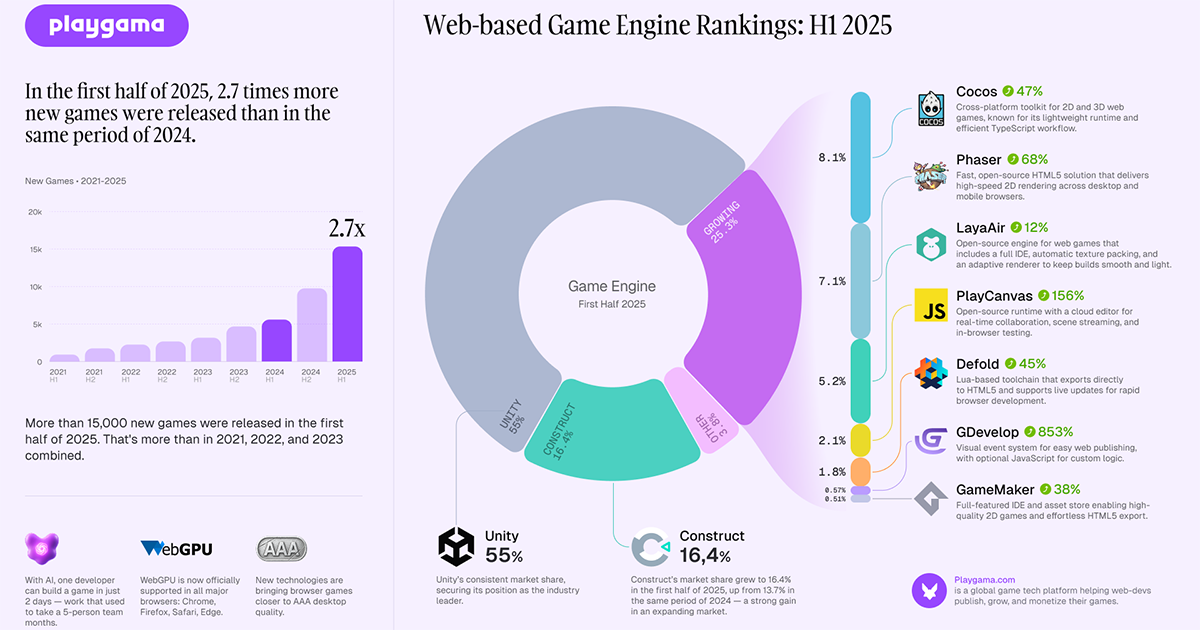 В отчете также представлен рейтинг популярности игровых движков для веб-разработки. Лидирующую позицию уверенно занимает Unity, на котором создано 55 процентов всех браузерных игр, вышедших в отчетный период. На втором месте расположился Construct с долей рынка 16,4 процента, показав рост по сравнению с 13,7 процентами в первом полугодии 2024 года. В число наиболее часто используемых движков также вошли Cocos, Phaser, LayaAir, PlayCanvas, Defold, GDevelop и GameMaker.
