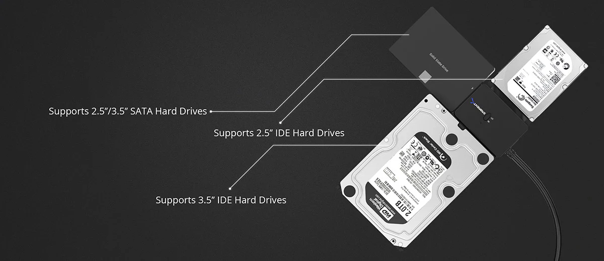 Универсальный адаптер совместим с 2,5-дюймовыми, 3,5-дюймовыми и 5,25-дюймовыми дисками SATA и IDE, включая жесткие диски (HDD), твердотельные накопители (SSD) и оптические приводы, такие как устройства записи компакт-дисков и DVD.