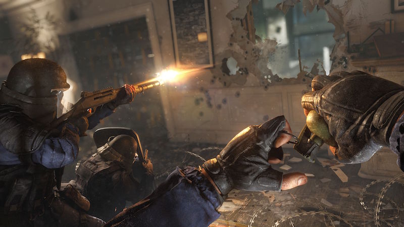 А здесь у нас ещё один кадр, пытающийся блеснуть механикой и возможностями игры, при этом стараясь выглядеть покрасивее. Разрушаемая стена, закрывающийся щитом игрок, стрельба из дробовика, граната, колючая проволока в нижней правой части и неплохие детализированные текстуры. Проблема в том, что финальная версия игры далека от подобной красоты, и даже заявленная разрушаемость стен близко не стоит к тому, что видно на булшоте. Только взгляните на эти отдельные пулевые отверстия. Эх, если бы…