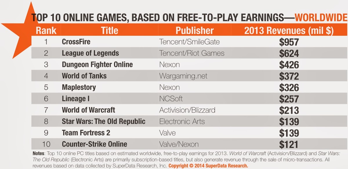 По данным агентства SuperData Research второй год подряд в тройку самых прибыльных игр в мире входят МОБА League of Legends, шутер Crossfire и аркадный файтинг Dungeon Fighter Online.