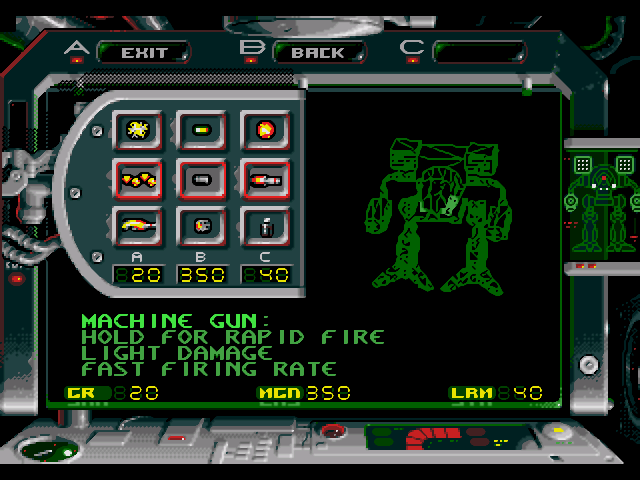 Эта игра по-своему уникальна. Еще не встречал на 16 битной приставки такой игры, в которой можно было так подробно прокачать робота! Это же просто фантастика! В панеле установки на робота оборудования использован трехмерный каркас робота, что очень впечатляет. При установке оружия на разные части робота, соотвественно вертеться и сам каркас, чтобы подробно увидеть, куда будет установлена та или иная пушка.