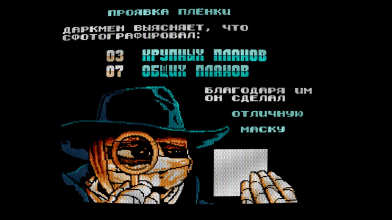 Было бы и правда неплохо возродить эту вселенную. Помню заигрывался в NES игру, повезло в детстве заполучить картридж с этим DarkMan. Вот и сейчас решил через эмуль пройти, оказывается энтузиасты русификатор сделали. Прикольная особенность игры то, что герой с помощью фотографий может сделать маску лица человека и притвориться им, геймплей будет отличаться за разных людей.