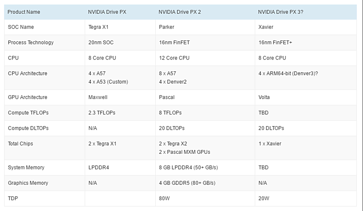 Tegra Parker SOC впервые показан на Drive PX 2, который поставляется с двумя такими модулями Tegra и даже больше пространства для поддержки специализированных MXM видеокарты. Этот продукт пакеты 12 процессорных ядер, четыре графических процессора Pascal (2 Tegra / 2 MXM) с 8 Тфлопс от FP32 и 24 TFLOPS из INT8 вычислений. Мы уже видели продукт упаковки два графических процессора GP106 в форм-факторе MXM, поэтому мы ожидаем, что-то близкое к GTX 1060 (Notebook) на 2 решения от NVIDIA Drive PX.