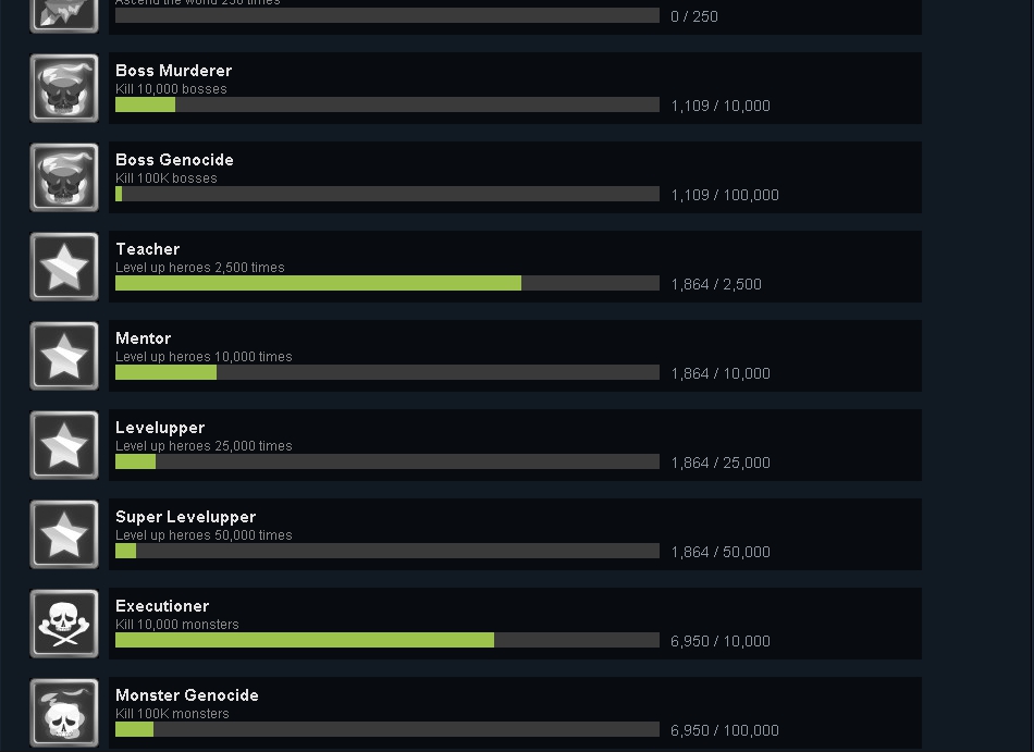 Нафиг вообще ачивки? Я старая школа. Я играю в свое удовольствие и ни на минуту не задержусь в игре, если она мне надоест. Я так понимаю, ачивки, это как члены. Ими меряются школляры на переменах. Для меня есть только Квесты. Выполнил задание, получил награду и опыт, прокачал героя, смог победить босса.