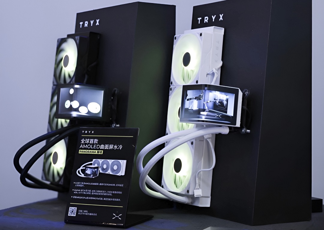Сегодня дисплей, встроенный в крышку процессорного водоблока, сложно назвать чем-то необычным. Многие крупные производители, такие как ASUS, предлагают подобные решения в своем ассортименте. Однако китайская компания TRYX смогла выделиться, применив в своих системах жидкостного охлаждения Panorama уникальный изогнутый AMOLED-экран.