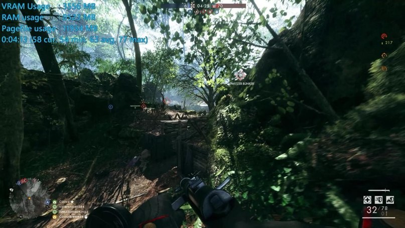 При запуске этой же игры на GeForce GTX 1060 6GB на таких же настройках, пик использования оперативной памяти составил 8,5 Гбайт, при этом из видеопамяти было выделено 3,5 Гбайт, а файл подкачки вырос до 12 Гбайт. Что же произойдет при использовании видеокарты с меньшим буфером видеопамяти, ведь Battlefield 1 требует больше VRAM?