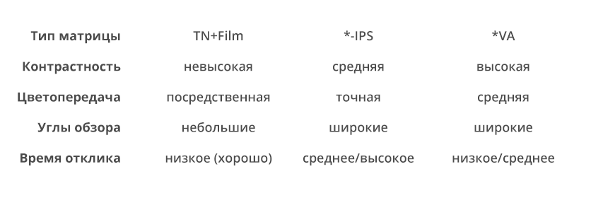 Немного технических подробностей: не вдаваясь в дебри спецификаций, приведём сравнительную таблицу свойств различных типов матриц.