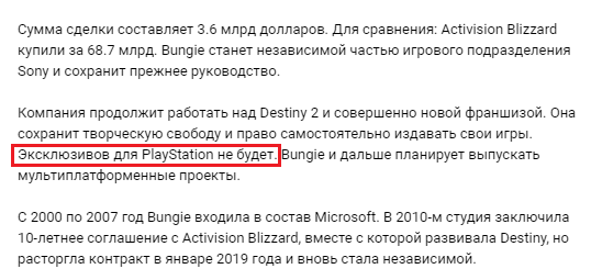 По сравнению с покупкой Близзард это просто пшик. Что у Bungie есть, кроме дестени по сути и ничего. А ведь инсайдеры так хайпили и говорили, что скоро состоится покупка которая затмит майков но по итогу, просто пыль в глаза. Даже если они сделают дестени 3 экзом плестейшон, вряд ли ради нее кто-то побежит в магазин за консолью. А вот если майки после того как кончится контракт, захотят сделать код либо временным или постоянным экзом бокса, владельцы пс5 первые же свои приставки на продажу выставят.