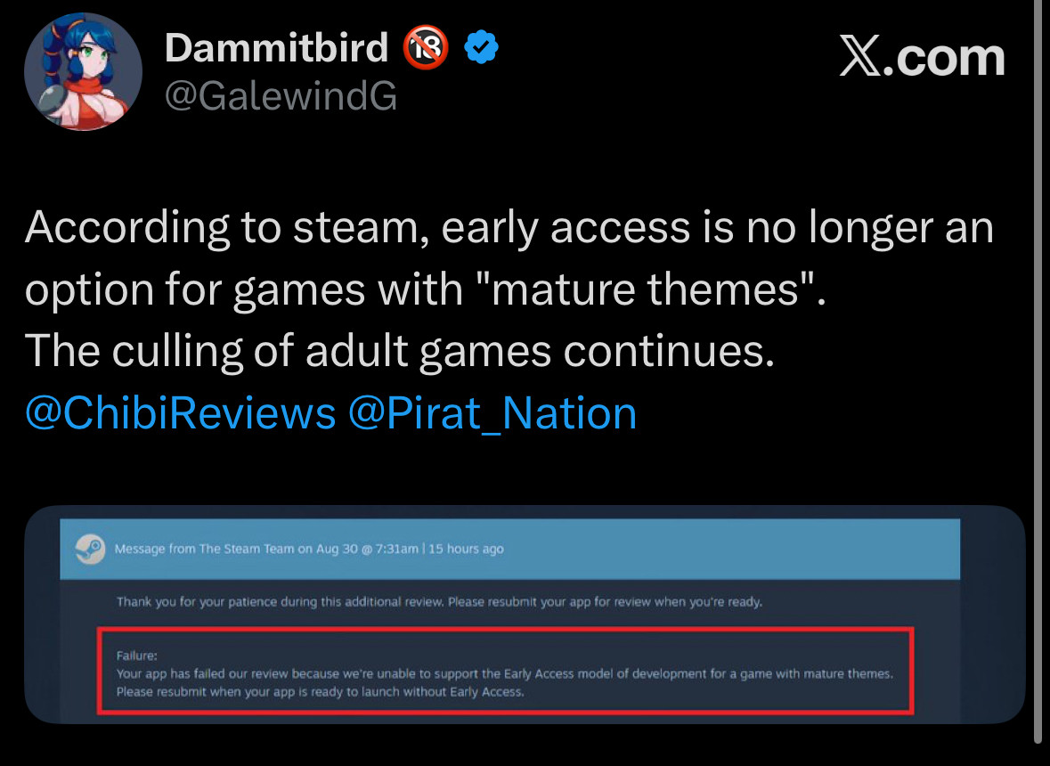 Согласно сообщениям разработчиков, Valve отказывает в одобрении игр с рейтингом «взрослые», которые должны были выйти в раннем доступе, даже если они не содержат нелегального контента. Компания, по-видимому, обеспокоена тем, что в такие игры могут быть добавлены недавно запрещённые элементы в процессе разработки.