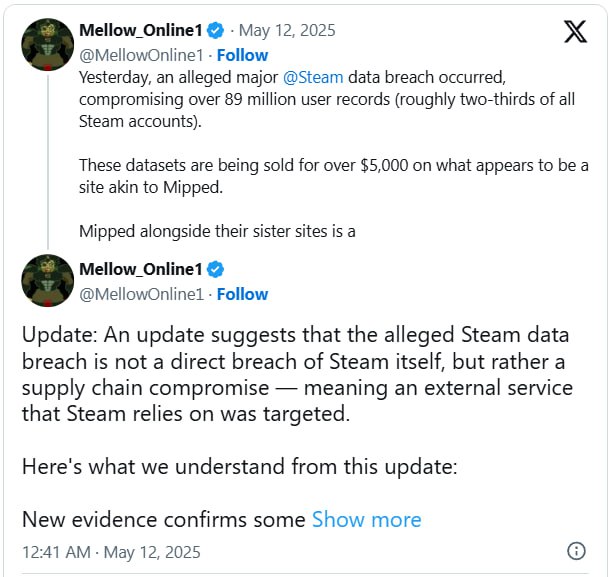 Первоначально предполагалось, что утечка произошла непосредственно из систем Steam. Однако, по последним данным, проблема может быть связана не с прямым взломом серверов Valve, а с компрометацией одного из сторонних сервисов, с которым сотрудничает Steam. Это указывает на возможную атаку через цепочку поставок, когда целью становится менее защищенный партнер компании.