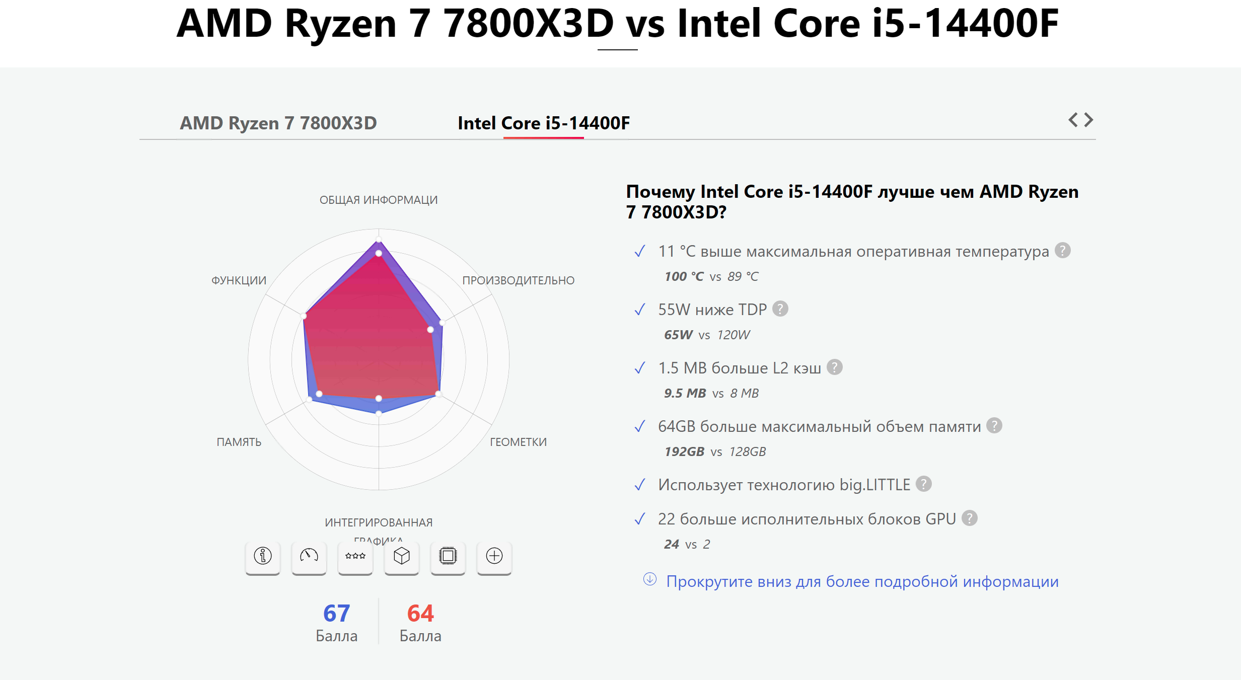 i5-14400F паритет Ryzen 7 7800X3D и стоит дешевле в 2 раза. 20 тыщ. против 46 тыщ.