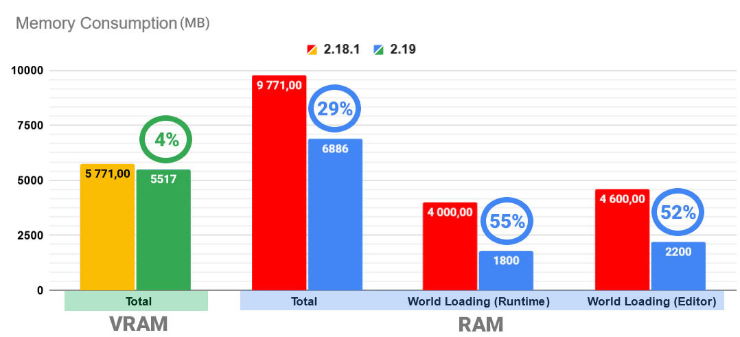 Аллокатор UNIGINE был доработан с целью улучшения управления выделением оперативной и видеопамяти в процессе работы приложения, что значительно ускорило процесс и сделало его более эффективным. Что позволяет добиться снижения общего потребления памяти примерно на 30%.