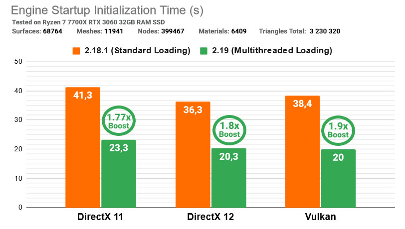 Данные о геометрии и свойствах (properties) теперь загружаются асинхронно в отдельных потоках параллельно с загрузкой материалов, за счет чего значительно уменьшается, а то и вовсе сводится к нулю, их вклад в общее время загрузки на старте, поскольку главным образом это время зависит от инициализации Файловой системы и загрузки материалов. Загрузка текстур также ускорилась за счет более эффективного распараллеливания процессов.