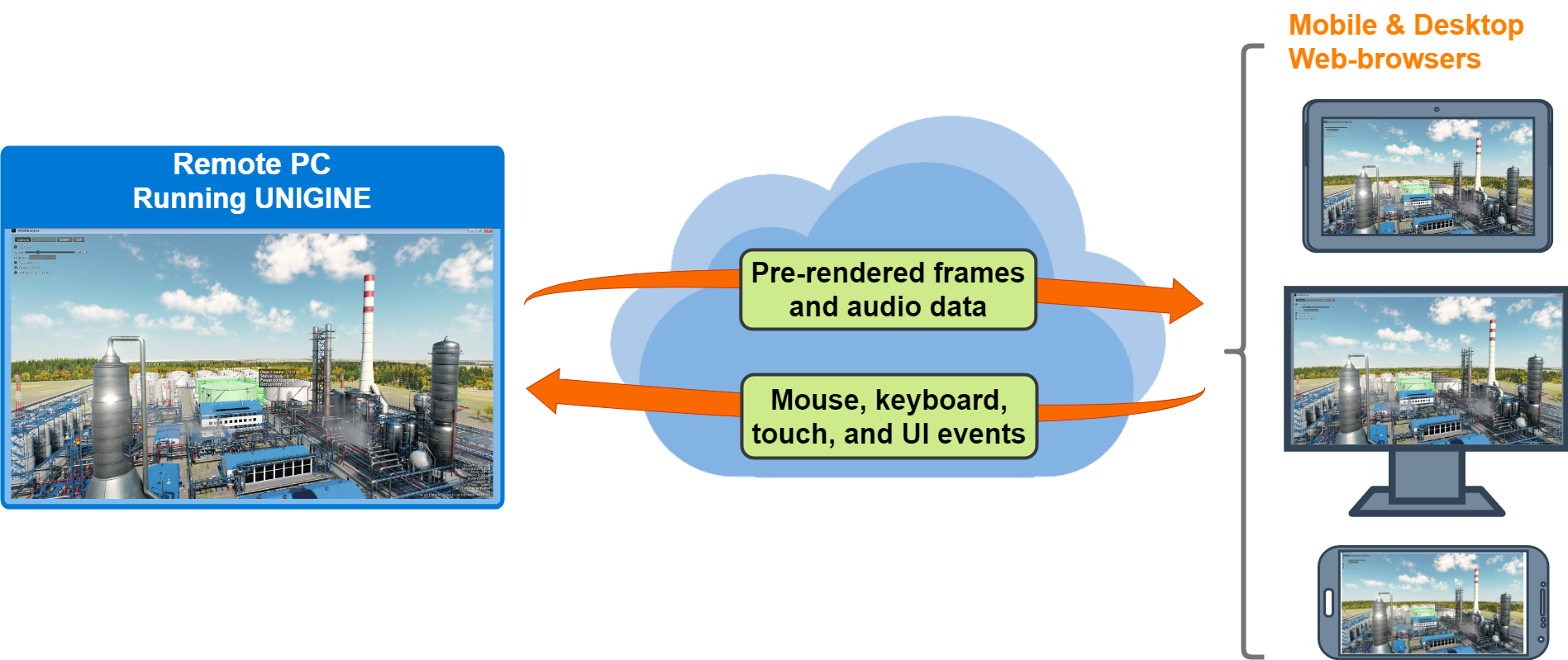 Это позволяет развернуть UNIGINE-приложение в облаке (на мощном компьютере в ЦОД) и подключаться к нему через тонкого клиента из любой точки сети Internet (с ноутбука, планшета или телефона).