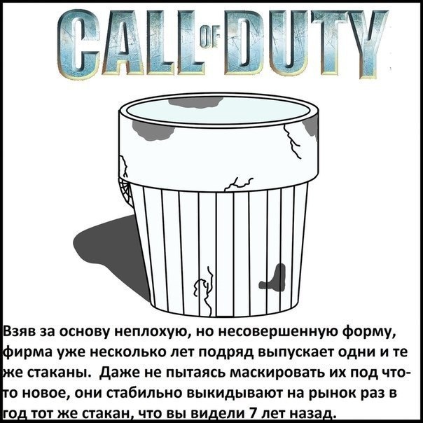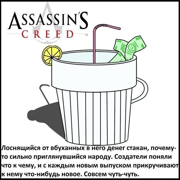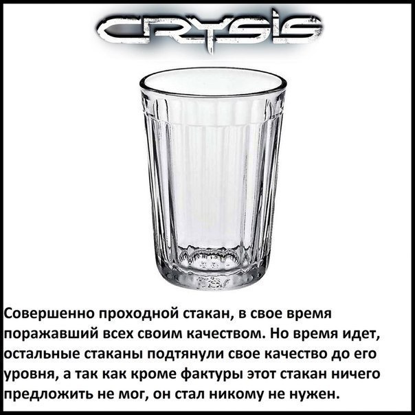 Стакан по имени "Кризис" даже здесь выделяется качеством визуализации. Брехня, что он никому не нужен и другие вовсе ещё не дотянулись до его качества. На вопрос "почему Ассассин понравился народу" отвечу отсебятиной - это продвинутый Принц, которого я обожаю. Для тех кто вырос. Это же эталон платформера был. И есть. Вот бы Юбики нового Принца запилили на нексте. НФС в своем репертуаре - "мыльная опера" в которую играют и ругают все кому не лень. Стаканчик "Дутого Кала" совсем не такой. Он самый дорогой. А БФ только силится добиться того же. ГТА ... для школьников... с компотом.