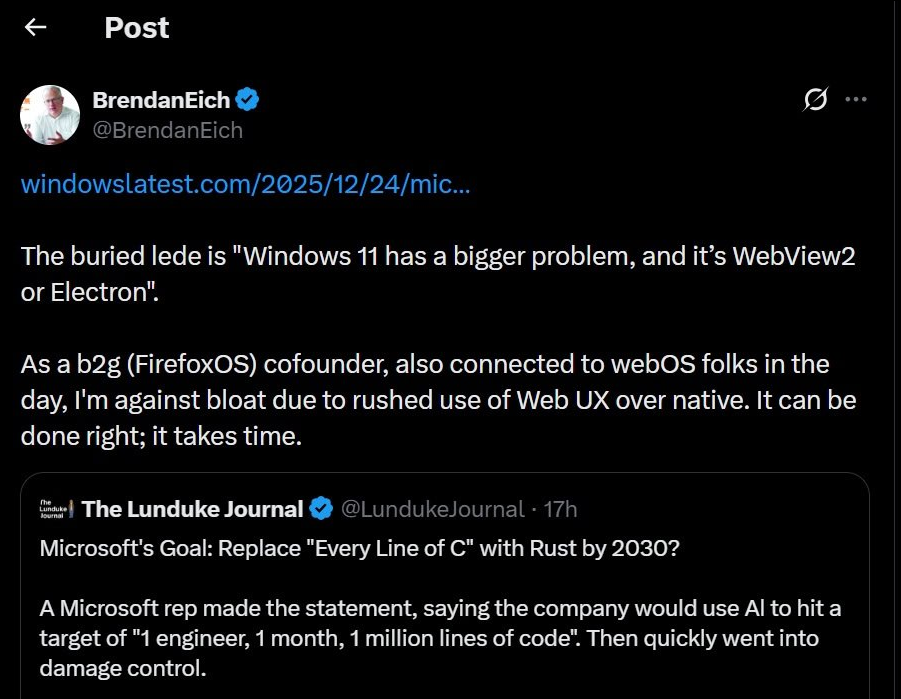 Создатель языка программирования JavaScript и сооснователь Mozilla Брендан Айк высказал свое мнение о текущем техническом состоянии операционной системы от Microsoft. Внимание известного разработчика привлекла недавняя дискуссия вокруг стратегии корпорации по написанию кода, однако он указал на более насущную и очевидную проблему. Айк считает, что главной бедой современной Windows 11 является не столько выбор языка программирования для ядра, сколько чрезмерное увлечение веб-интерфейсами вроде WebView2 и Electron в ущерб нативной производительности.