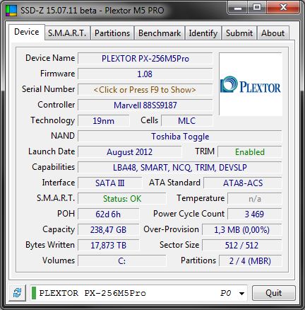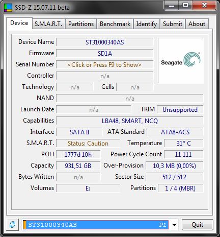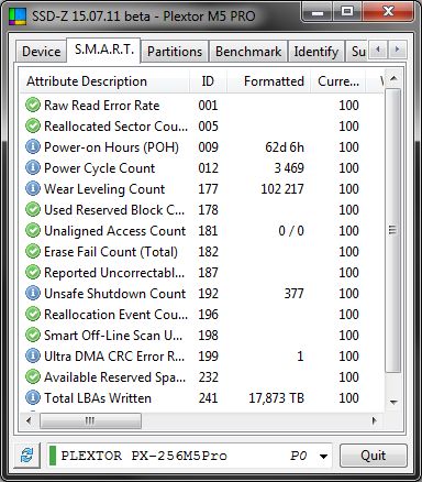 И так вкладка "Device" открывается по умолчанию при запуске программы и даёт общую информацию о выбранном накопителе. Сменить его можно щёлкнув по стрелке внизу и выбрав нужный накопитель из списка доступных. Разумеется, полнота информации будет разница в зависимости от типа накопителя. И так пройдёмся по тому, что можно узнать о накопителе. Это, прежде всего его название(Device Name). Затем версия прошивки(Firmware), а также серийный номер(Serial Number) но для этого нужно нажать F9, за что авторам спасибо. Ибо лишний раз светить серийник на скриншотах не стоит. Так же можно узнать тип памяти(Cells), технологию про-ва(Technology) и производителя памяти(NAND). Самым же важным является при покупке это посмотреть дату про-ва(Launch Date), работает ли TRIM(TRIM), общее время работы(POH), а так же кол-во включений накопителя(Power Cycle Count). Можно так же посмотреть к какому интерфейсу подключён накопитель(Interface) и текущий режим работы (АТА Standard) и, разумеется, статус S.M.A.R.T.(S.M.A.R.T.). Так же будет полезна строка(Controller) где отобразится маркировка контроллера, на котором построен накопитель. Это полезно особенно в свете того что, например производители любят менять контроллер от партии к партии. Разумеется, утилита не гарантирует правильное определение, но хотя бы что-то. Перейдём к следующей вкладке "S.M.A.R.T.)".