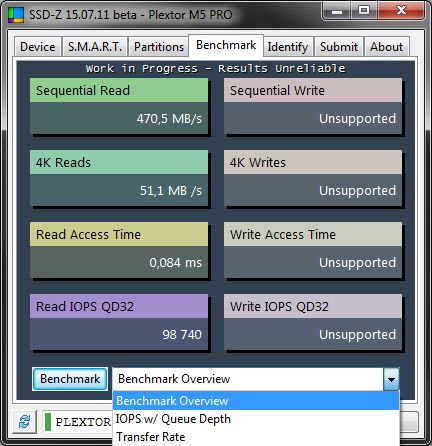 На данной вкладке можно провести тестирование накопителя по различным параметрам. Для этого выберите из списка нужный тест и щёлкните на кнопке "Benchmark" и дождитесь окончания теста. Среди тестов есть общее тестирование(Benchmark Overview),тест в режиме обычной работы с блоками 4k(IOPSw/Queue Depth),вилка скорости передачи данных при этом(Transfer Rate),тест на скорость доступа к данным(Random Access Time) и т.д. Перейдём к следующей вкладке "Identify".