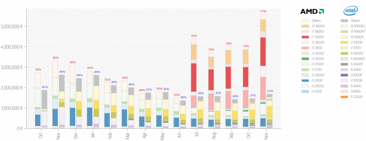В показателях выручки AMD в ноябре оторвалась от конкурента сильнее, чем в прошлые месяцы. Реализация этих процессоров принесла немецкому магазину 77 % ноябрьской выручки, продукция Intel довольствовалась только 23 %. Самыми популярными остаются Ryzen 7 3700X и Ryzen 5 3600, не теряется на их фоне и Ryzen 9 3900X, который до появления Ryzen 9 3950X оставался старшей моделью семейства Matisse.