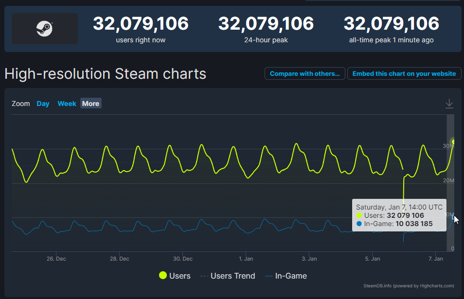 7 января Steam преодолел отметку в 32 миллиона пользователей, достигнув пика в 32,079 миллиона одновременных игроков. Также на платформе Valve впервые в истории более 10 миллионов игроков находились непосредственно в играх.
