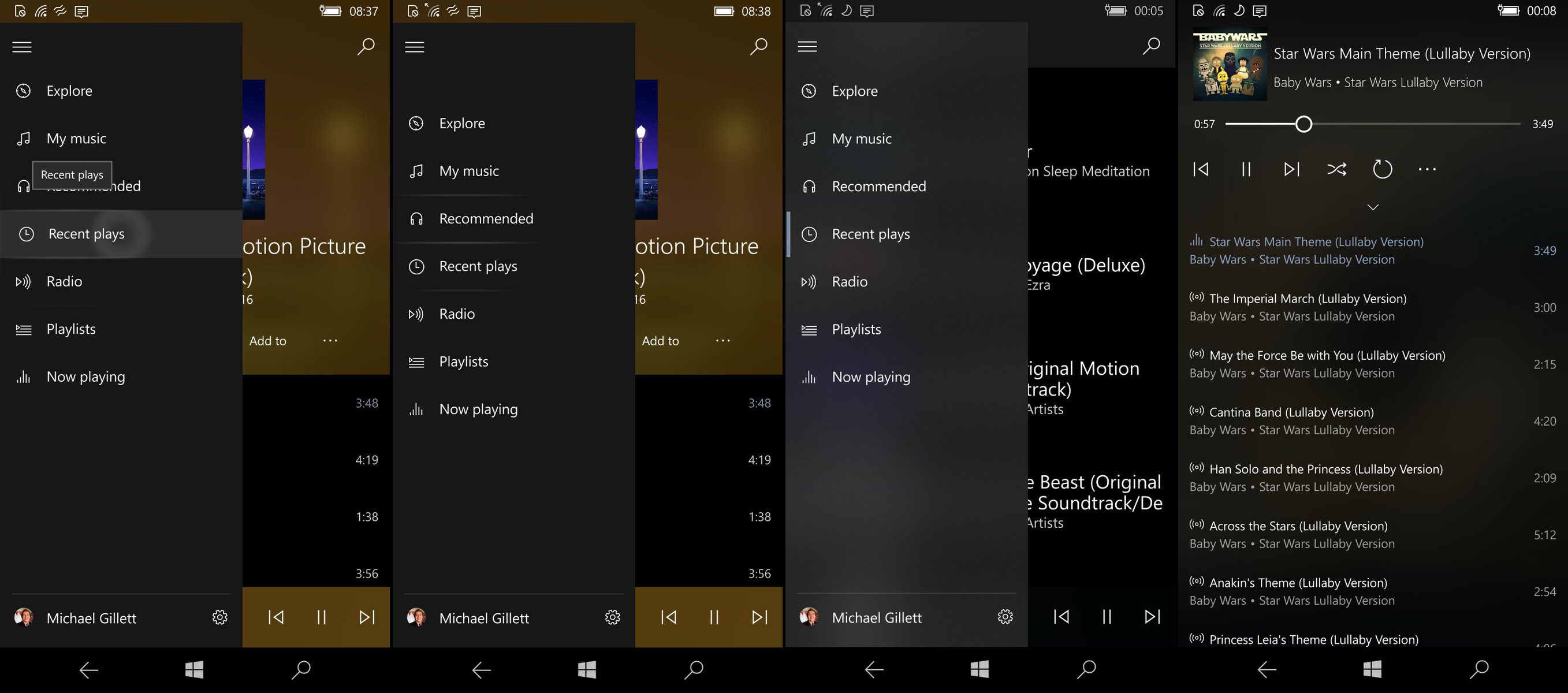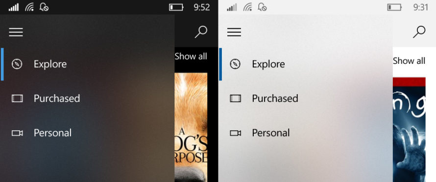 Недавние обновления ряда приложений Microsoft, включая «Музыку Groove» и «Кино и ТВ», указывают на то, что все основные элементы Fluent Design, включая прозрачность Acrylic, поддерживаются и в Windows 10 Mobile. Наиболее очевидные примеры использования Fluent Design — новые анимации и полупрозрачное меню-гамбургер.
