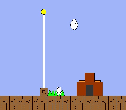 Syobon no Action - это какой-то кошмар параноика. Все четыре уровня в буквальном смысле напичканы различными "сюрпризами" - то потолок на голову упадет, то пол обрушится, то враги вылетают из самых неожиданных мест, то шипы на некоторых блоках замаскировались, то труба, в которую вы зашли, выплюнет не туда, то скрытый блок с монеткой появляется в самых неподходящих местах, из-за чего все время падаем в яму. А какие здесь "бонусы"! Уверен, в порыве ярости вы можете просто раздолбать клавиатуру. Слава богу, в игре предусмотрены чекпоинты, что сохраняет пару-другую нервных клеток.