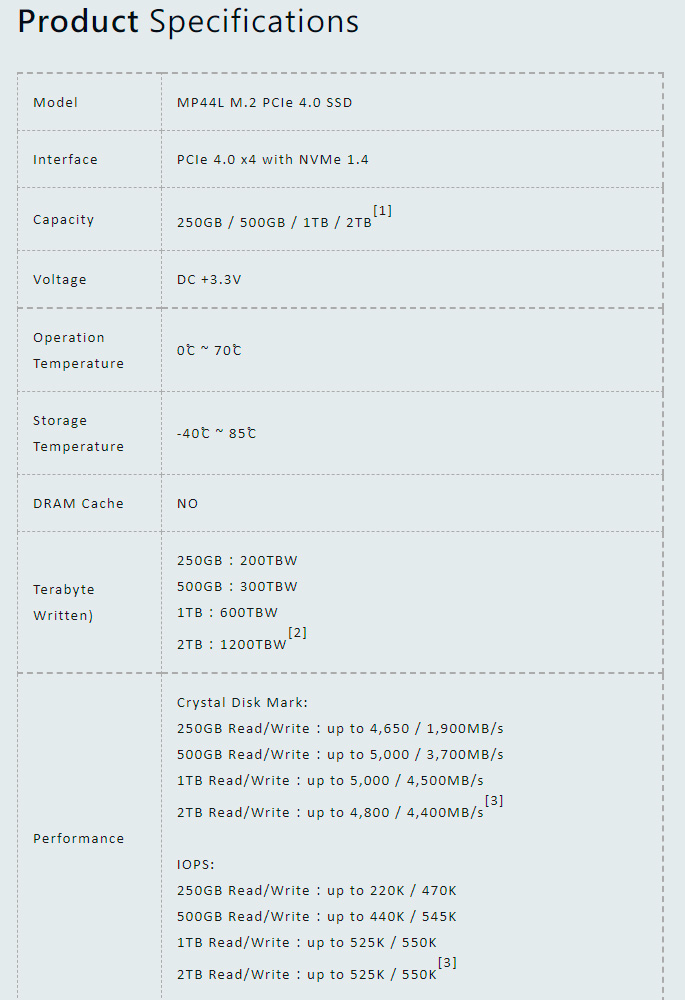 Что касается скоростей работы, модели ёмкостью 250 и 500 ГБ, а также 1 и 2 ТБ, характеризуются скоростью чтения 4560-5000 МБ/с, скорость записи 1900-4500 МБ/с, а показатели IOPS достигают 525 тыс/550 тыс при чтении/записи. На приличный ресурс намекает 5-летний гарантийный срок.