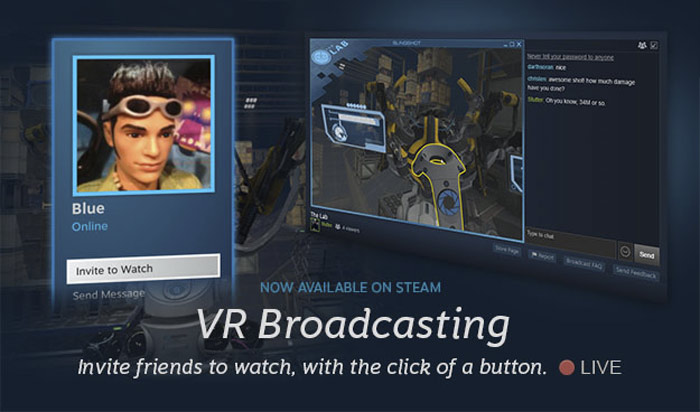 Компания Valve сообщила, что теперь у всех пользователей Steam появилась возможность транслировать и смотреть стримы SteamVR игр через систему Трансляций Steam.