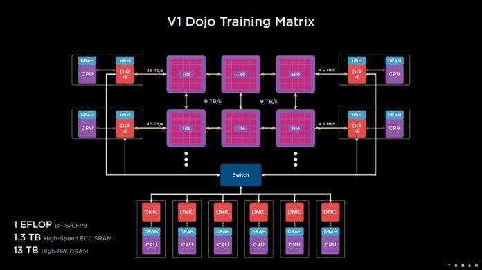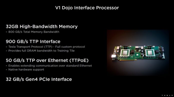 Существует интегрированная обработка штампов D1 мощностью 15 киловатт на каждые двадцать пять штампов. В комплекте с двадцатью пятью кристаллами D1 Tesla также включает сорок кристаллов ввода-вывода, которые намного меньше. Пользовательский суперкомпьютер с искусственным интеллектом Tesla Dojo оснащен пятью картами, использующими хост-сервера на интерфейсе PCIe, и обеспечивает пропускную способность 4,5 ТБ/сек на каждой плате.