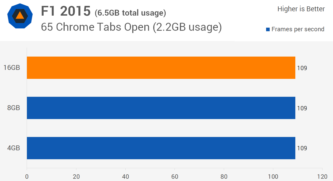 Результат? FPS в Grand Theft Auto V снизился на один кадр (с 56fps в 55fps), а при переходе от 4 Гб до 16 Гб нет никакой выгоды в производительности . Такие же результаты с Batman: Arkham Knight и F1 2015.