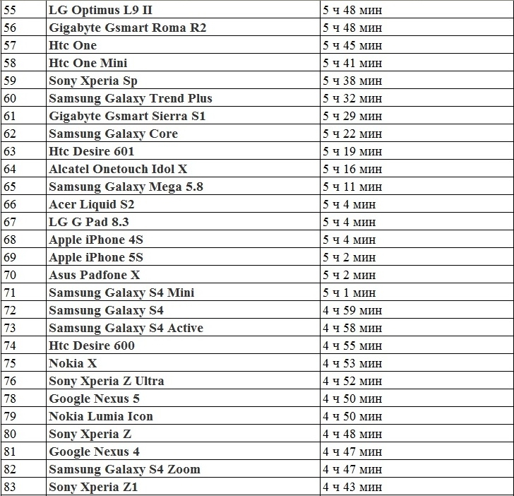 Чтобы не разводить полемику о достижениях производителей на поприще внедрения энергосберегающих решений, достаточно выбрать пятёрку самых популярных флагманов на сегодня и посмотреть на занятое в рейтинге место. Вывод напрашивается сам за себя: бьющий рекорды продаж LG G3 с результатом 6 часов 13 мин (данный показатель даже хуже, чем в модели G2) зарезервировал 39 место; Samsung Galaxy S5 и его честно отработанные 7 часов 38 минут поместили модель на 18 место; iPhone 5s удостоился 69 строчки; фирменный 5-дюймовый Nexus-смартфон оказался лишь под номером 78.