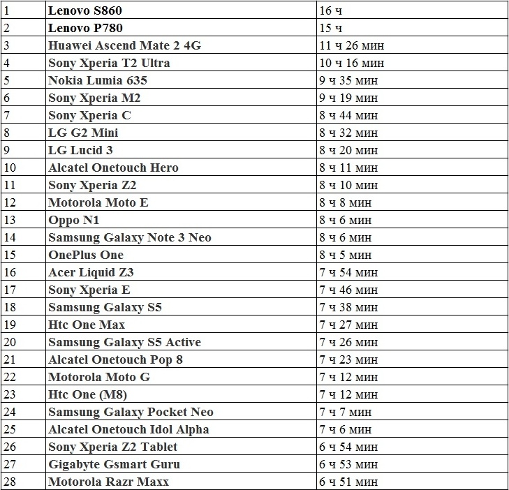 Чтобы помочь сделать правильный выбор среди изобилия разных по производительности и размерам дисплея смартфонов, не ориентируясь лишь на указанные четыре цифры на аккумуляторе, журналисты сайта PhoneArena провели независимые испытания. И хотя в рамках теста не были исследованы возможности автономной работы того же THL 5000 или Philips W6618 с батареей на 5300 мА·ч, количество участников и их параметры позволяет выставить объективную оценку не только конкретной модели, но и отдельной линейке с тем или иным логотипом.